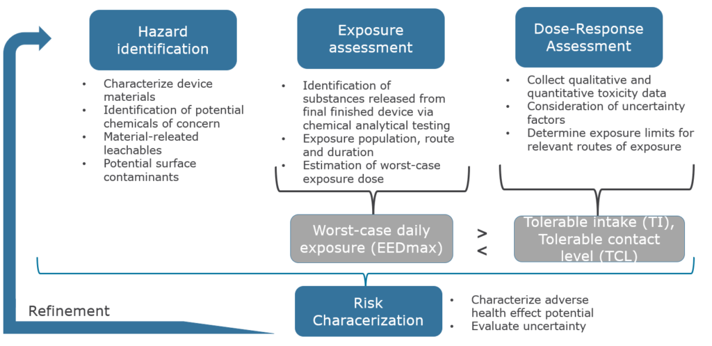 A toxicological risk assessment or TRA is a multi-step process that estimates the risk of adverse health events from exposure to leachable substances from a medical device. It encompasses the scientific review and evaluation of all relevant scientific data on the toxicity of, and the exposure to, a certain compound or mixture (Younes, 2014). Components of a toxicological risk assessment are shown in the figure.